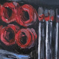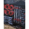 Gym Studio presents stillness where energy once roamed. The artist captures an interior space poised between motion and silence — mats, ropes, and brushes of red light hint at activity paused. The composition is dominated by deep blacks, grays, and flashes of red, creating a rhythm that feels both industrial and intimate. Each object — coiled straps, metallic bars, folded towels — becomes part of a visual symphony of repetition and balance. The use of impasto adds tactile weight, evoking surfaces worn by practice and persistence. There is no figure here, yet the presence of the human spirit is palpable: traces of exertion, preparation, and focus linger in the air.