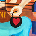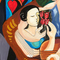 Valentine’s Day (1): the title refers to the celebration of love and intimacy depicted in the scene. The inspiration behind this piece was to capture a moment of romantic affection mixed with artistic expression—two women, one playing guitar and the other holding roses, surrounded by heart motifs that symbolize Valentine’s Day emotions. The technique blends cubist-inspired geometric abstraction with expressive color choices, using bold brushstrokes and layered planes to give the figures and objects a textured, modern feel. Acrylic or oil paint is applied in vibrant blocks of blue, green, orange, and red, emphasizing the emotional energy of the composition .