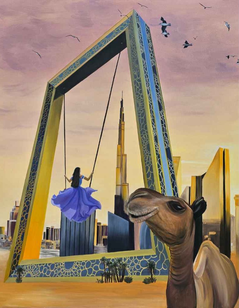 Framed Out was painted by Marya Adnan in 2020, during a time of global stillness and uncertainty. Having just graduated amid the pandemic, Marya found herself filled with aspirations, yet unsure of what lay ahead. This piece became a personal anchor—a reminder to stay hopeful, to dream freely, and to trust in life’s unfolding journey. Born and raised in Dubai, Marya has witnessed the city evolve from its traditional roots into a dazzling metropolis. This painting reflects that duality: the camel symbolizes old Dubai—its rich heritage, culture, and resilience—while the Dubai Frame stands tall in the distance, like a shimmering portal to the future. The girl flowing with the wind embodies every dreamer, moving forward with grace and purpose.