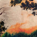 Golden Horizon presents a landscape of nature suspended between presence and memory. Slender tree trunks rise and curve gracefully through the composition, their branches reaching outward like quiet gestures across the canvas. The foliage, rendered in deep greens and shadowed blues, forms a delicate lattice that frames the sky rather than enclosing it, allowing light and atmosphere to remain central. Behind the trees, the sky glows with layered washes of amber, ochre, soft rose, and muted gold. These colors feel less like a literal sunset and more like an emotional state—warm, fleeting, and gently unsettled.