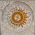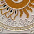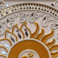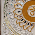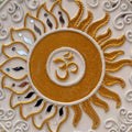 The Sun stands for cosmic energy, vitality, and the life-sustaining force that nourishes all existence. The central sacred sound “Om” reflects the primordial vibration of creation, where each syllable holds deeper meaning — “A” represents creation and the energy of Brahma, “U” signifies preservation associated with Vishnu, and “M” symbolizes transformation and dissolution connected to Shiva. The harmonious combination of these elements creates a meditative visual space that reflects balance between earth and light. The detailed Lippan texture enhances the spiritual essence of the artwork, inviting contemplation and inner reflection. This mandala serves as more than a decorative piece; it is a symbolic representation of cosmic harmony, spiritual clarity, and the timeless connection between life, energy, and consciousness.