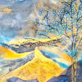 Where Something Still Grows speaks of endurance rather than arrival. A solitary tree rises from a textured ground, its roots exposed and extending downward as much as its branches reach upward. The landscape around it feels unsettled — layered with movement, shifting tones, and traces of erosion — yet the tree remains, not triumphant, but present. The composition holds a quiet tension between fragility and persistence. Gold appears subtly within the branches and surrounding space, not as decoration, but as a sign of life continuing in places that feel uncertain or worn. The sky and ground seem to move independently, creating a sense of instability that contrasts with the form's rooted stillness.