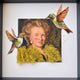 The work transcends the canvas, incorporating fabric and embellishments that add depth, texture, and story. A mixed media painting where art meets fashion—oil-painted elegance adorned with real fabrics, textured stones, and canvas-appliqué birds. One rests gently on her shoulder, the other soars beside her, whispering forgotten celestial truths. Her soul listens, recognizing the divine wisdom woven into every thread, feather, and brushstroke. A vision of beauty, memory, and spiritual awakening.