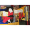 The seated figures in panels on the right evoke bureaucracy, confinement, or identity stripped to a number. The red abstract shape in the sky may represent violence, surveillance, or chaos hovering above displaced lives. I want the viewer to see the fragility of the human body when placed against overwhelming forces—the silent strength of families holding together amid uncertainty. The child lying between adults is a symbol of both vulnerability and hope.