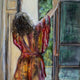 This painting conveys a vivid sense of calm and stillness. The woman, surrounded by the morning routine of breakfast objects -- coffee, toast, jars, and containers -- is quietly enjoying a moment of solitude. The vintage colors of the setting convey the contemplative mood of this everyday scene. This painting celebrates the beauty of everyday moments, the poetry of the ‘still life’ that awaits us all in our kitchens, sitting rooms, and gardens.