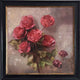 This painting features a delicate still life composition of roses, rendered in soft yet expressive brushstrokes. The focal point is a cluster of pink and peach roses, some in full bloom and others beginning to wilt, placed gently on a dark surface. Their petals are richly textured, conveying both fragility and beauty, while the surrounding green leaves add a touch of contrast.