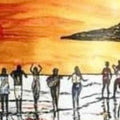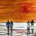 The orange and golden sky, alive with the descending sun, sets the tone of serenity and nostalgia. It is a moment suspended between day and night, reality and memory — the kind of twilight hour that etches itself into the soul. Each figure contributes to the narrative: some walk hand in hand, others dance or play music, together creating a symphony of joy and belonging. Beyond its depiction of togetherness, the painting also reflects on the impermanence of time. Just as the sun dips beneath the horizon, moments of happiness are fleeting — yet their resonance lingers.