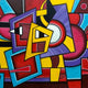 An abstract painting in the cubist style with a Red Tulip (Symbol of perfect love) as it's centerpiece. The background is done in semi art deco style with a combination of straight and curved lines.