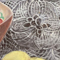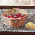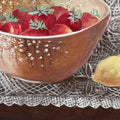 “Strawberry and Lemon” depicts a serene still life of ripe strawberries in an earthen bowl paired with two glowing lemons set against delicate lace. The composition balances warmth and freshness through rich reds and bright yellows, enhanced by soft reflections and fine textures. By transforming an ordinary table scene into a study of light, color, and surface, the work captures the quiet intimacy of everyday life and invites calm reflection.
