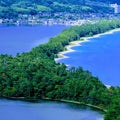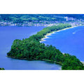 Stretching gracefully across a serene expanse of sapphire water, this photograph captures the stunning beauty of Amanohashidate — Japan’s “Bridge to Heaven.” The narrow sandbar, lined with ancient pines, appears to float effortlessly between two shores, as if bridging earth and sky. The deep greens of the forest contrast with the tranquil blues of the sea, forming a composition that feels both divine and grounded in quiet reality.