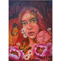 The painting is a breathtaking artwork in mixed media and oils that captures the essence of hope, dreams, and transformation. At its center stands a beautiful maiden, her flowing hair blending seamlessly with the vibrant hues of the surrounding blossoms. Her eyes shine with determination as she gazes toward the viewer yearning to take flight. Delicate butterflies, their wings shimmering with iridescent colors, dance around her, whispering tales of freedom and endless possibilities. Ethereal light bathes the scene, illuminating her, as if she is on the verge of sprouting wings. The textures and brushstrokes create depth, symbolizing the journey of growth and self-discovery. This painting radiates positivity, encouraging viewers to embrace their aspirations fearlessly. The fusion of color, movement, and symbolism makes it a powerful visual representation of transformation and boundless potential.