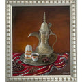 This artwork captures the timeless essence of Arabian hospitality through a beautifully detailed still life of a traditional dallah, steaming Arabic coffee, and fresh dates. Set against a warm, earthy background, the composition highlights the elegance of the brass pot and the delicate patterns on the finjan cups. The red woven fabric beneath the tray adds a touch of Emirati heritage, symbolizing warmth, generosity, and cultural pride. Every element— from the rising steam to the polished metal and textured fabric—reflects a moment of quiet tradition, inviting the viewer into a peaceful Emirati majlis.