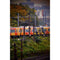 This photograph captures a fleeting moment where urban life and seasonal color intersect beautifully. A train painted in bold shades of orange and gold, its exterior patterned like flickering flames, glides along the elevated tracks. The warm tones of the train seem to echo the autumn foliage behind it — a canopy of trees shifting through deep greens into rusty oranges and soft yellows. In the foreground, a dense network of power lines, poles, and metal crossbeams crisscrosses the frame, creating a lattice of urban geometry. The cables stretch outward in all directions, forming a web that contrasts sharply with the soft, organic textures of the hillside below.