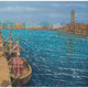 This is an acrylic painting using the technique of blocking in and glazing before the additional details are added on to the subjects. The artist uses the waters of Dubai Creek and abra (water taxi) as her inspirational subject for this painting. The painting is set in under the sunset sky where the banks of Dubai Creek glows in faded vision. The artist's focal subject is abra, which is a half boat and half raft made of wood. Abras, which means 'to cross' are a significant part of Dubai Marine transportation transporting people and goods from two shores of Bur Dubai and Deira. The background of the setting sky is painted in shades of ultramarine blue, deep turquoise, orange and burnt orange to that creates the afterglow of sunset and fading skyline of Dubai Creek.