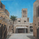 The painting is titled “Doorway” and was created by Iranian artist Mehrnoosh Torkzadeh. The painting is a detailed oil on canvas depiction of a traditional Iranian village street. The focal point of the artwork is a stone building with a heavy wooden door. Several worn steps lead up to the doorway. The door itself is adorned with an elaborate metal knocker. To the right of the doorway is a large pot filled with vibrant red flowers. Sunlight filters through the doorway, casting shadows across the steps and the street. The background of the painting features parts of other buildings lining the street. The painting creates a sense of tranquility and quietude. The muted colors and lack of people in the scene contribute to this feeling. The only signs of life are the flowers and the worn steps, which hint at the comings and goings of the village residents.