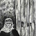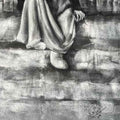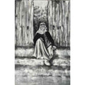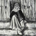 This monochrome charcoal painting captures a moment of stillness and quiet strength. At the center sits a figure, likely an elder, draped in traditional attire with a headscarf framing a weathered face. The choice of black, white, and shades of gray adds a timeless quality, evoking both nostalgia and resilience.