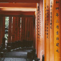 This photograph pulls you into the heart of a sacred passage — a tunnel of vibrant orange torii gates stretching forward in perfect repetition, each one framing the next like an endless series of doorways into quiet contemplation. The gates stand tall on both sides, their vertical lines creating a rhythmic corridor of color and shadow. Black kanji inscriptions run gracefully along each pillar, giving every gate a sense of identity, history, and devotion. As the rows continue, the perspective narrows, drawing the eye deeper into the path until it dissolves into soft darkness.