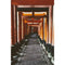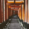 The stone walkway beneath is worn and textured, its uneven surfaces telling stories of countless footsteps — pilgrims, travelers, and seekers all moving through the same ritual journey. Faint patches of green peek through the structure, hinting at the forest outside, but here inside the corridor, the world feels suspended between earth and spirit. Light filters in softly from above, casting subtle highlights on the orange beams and creating a quiet interplay of brightness and shadow. The entire image radiates a sense of calm, reverence, and mystery — a moment where tradition wraps around you, guiding you forward one gate at a time.