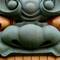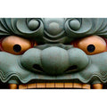 Dominating the frame with an almost hypnotic intensity, this photograph captures the face of a massive guardian statue — a dramatic fusion of power, mythology, and artistry. The image zooms in on the creature’s features: bulging bronze-gold eyes that seem alive with vigilance, a broad, textured snout of weathered green patina, and a fierce expression that straddles the line between protector and predator. Every curve and swirl in the sculpture’s design speaks of meticulous craftsmanship. The rusted tones and subtle abrasions on the metal surface tell a story of age and endurance, hinting at the cultural and spiritual weight of such figures in East Asian tradition. The close-up framing strips away distractions, forcing the viewer to confront the sheer emotion in the sculpture’s expression — strength, defiance, and silent watchfulness.