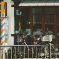 Below, a bicycle leans casually against the railing — an emblem of routine and stillness. The barber pole, with its iconic spiral of red, white, and blue, glows faintly in the sun, a timeless symbol of craft and care. The light is soft yet precise, brushing across the surfaces to reveal layers of texture — wood, metal, paint, and concrete — each carrying its own quiet patina of time. To the right, a construction sign intrudes gently into the frame, its yellow-and-black stripes contrasting with the calm geometry of the shopfront. It reminds us that the city is alive — constantly changing, always rebuilding.