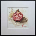 Pomegranate Half captures the exquisite tension between interior and exterior, between form and revelation. The artist dissects nature’s perfect sphere to expose a world of light, blood-red translucence, and quiet sensuality. Each seed glimmers like a jewel, individually rendered yet collectively organic, suspended in a structure that feels both sacred and alive. The cracked rind, painted with a mix of earth tones and deep burgundy, bears the texture of time — an emblem of fertility, vitality, and mortality intertwined. The light plays across the fruit’s fractured surface, emphasizing the contrast between the matte skin and the luminous pulp within.