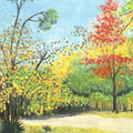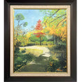 In "Autumn Leaves in the Botanical Garden", the artist captures the vibrant symphony of colors at the peak of the fall season. A lone red tree stands out at the center, anchoring the composition with warmth and contrast against a background of golden, green, and rust-colored foliage. The sun-dappled path invites viewers to wander through the serene garden, evoking the crisp, nostalgic beauty of a late-autumn afternoon. This piece would bring a gentle glow and a sense of tranquil reflection to any room.