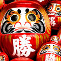 This photograph bursts with color and spirit — a sea of red Daruma dolls, each painted with wide, unblinking eyes and fierce expressions. They seem to gaze outward in unison, embodying centuries of Japanese tradition and the quiet intensity of human aspiration. The kanji character boldly painted on each doll, meaning “victory” or “success,” captures the collective essence of perseverance and faith.