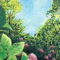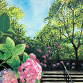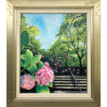 Hydrangea captures a peaceful moment of early summer, where sunlight filters through leafy branches and pink blooms guide the way up a shaded staircase. The hydrangeas in the foreground burst with delicate color and texture, drawing the viewer gently into the lush garden path beyond. With its classical composition and soft realism, this work offers a timeless elegance—ideal for calming interiors, hallways, or any space where one might long for a quiet, sunlit stroll.
