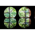 In Through Stillness, the world outside and its reflection merge into a quiet, almost sacred symmetry. The twin circular windows frame a living canvas of green — trees gently swaying, light filtering through leaves — while the polished surface below transforms the view into an ethereal mirror of itself. The result is a moment suspended between the tangible and the imagined, where reality folds into reflection. This composition celebrates harmony — between nature and architecture, light and shadow, stillness and life.