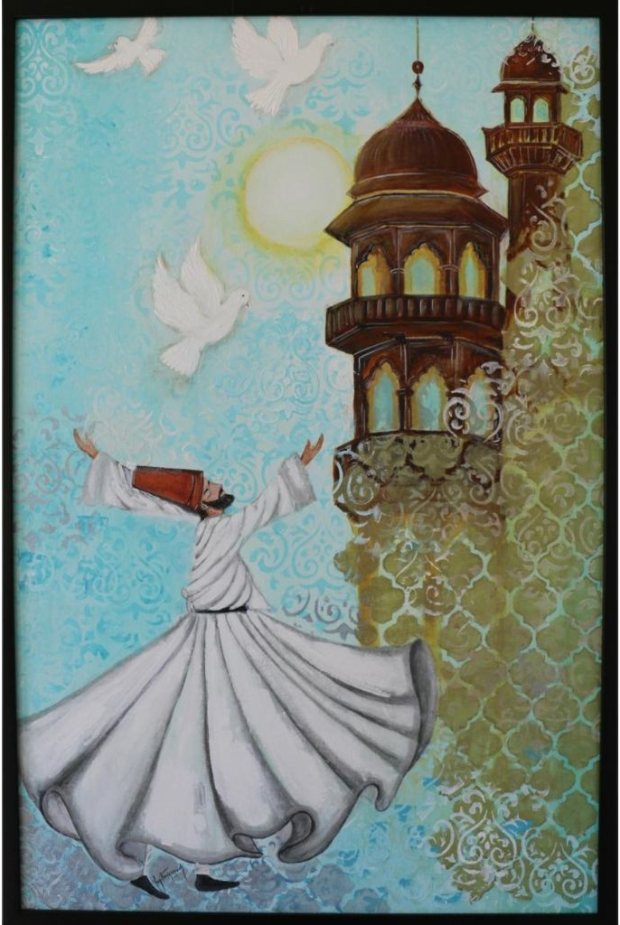 The painting depicts a Sufi dancer, a whirling dervish, lost in the meditative dance "Transcendence" is a captivating tableau where poetry meets visual artistry. At its heart, the painting features a mystical scene: a Darwish player, lost in the ecstatic dance of whirling, set against a backdrop rich with symbolism. intricate architecture silhouetted in the backdrop symbolizing materialism of earthly existence. A full moon casts its gentle glow, lending an ethereal luminescence to the scene, while two white doves, symbols of peace and spirituality, grace the composition with their serene presence.