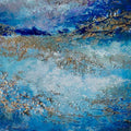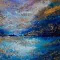 Veil of Night is an evocative abstract painting that explores the quiet power and mystery of darkness. Layers of richly textured acrylic unfold like shifting landscapes, where deep blues and indigo tones flow beneath luminous veils of violet, misty whites, and warm metallic gold. A moody, expressive work that highlights the dramatic shift, the moment when day shifts into night. Hints of light emerge through the darkness, as if moonlight or distant horizons are breaking through a nocturnal sky. The interplay between cool and warm tones creates a sense of movement and tension, balancing serenity with intensity. Gold accents catch the eye like scattered constellations, adding a subtle radiance that contrasts with the shadowy blues.