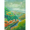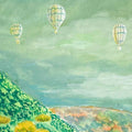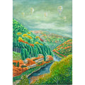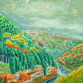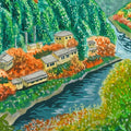 “Arashiyama” captures the vibrant charm of Kyoto’s landscape in autumn. Rolling hills glow with greens, golds, and reds as a quiet river flows past traditional houses below. Hot-air balloons drift across a misty sky, adding a sense of whimsy to the tranquil scene. Blending seasonal warmth with gentle adventure, the work evokes nostalgia and peaceful beauty, making it ideal for serene living or workspaces.