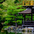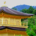 The composition balances serenity with grandeur. The mirrored reflection draws the eye downward, creating a near-perfect symmetry that blurs the line between the physical and the spiritual. The surrounding foliage — deep emeralds, soft sages, and muted forest tones — frames the temple in quiet contrast, allowing its radiance to breathe rather than boast. In this moment, time feels suspended. The mountains in the distance whisper of eternity, while the ripples on the water hint at impermanence — a delicate duality at the heart of Japanese aesthetics. This image is not just a portrait of a place, but a meditation on peace, reflection, and the beauty of stillness itself.