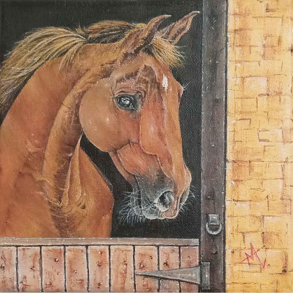 The artist adds a hint of a barn door that suggests the horse at a stable or a farm. The barn door is painted in shades of burnt umber, raw sienna, black and whites to highlight it uneven textures. The steel bolts on the door is painted in shades of raw sienna, grey and whites for a rustic look. The textures on the wooden ledge of the door is painted using black, burnt umber, cadmium red and white. Shades of naples yellow, yellow ochre, raw sienna and burnt umber are used to paint the outside wall for its warm look. In this painting, the horse standing near the door hints a visitor at the other side of the barn door!