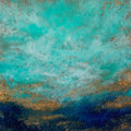 Raw, textured, and immersive. This abstract work on canvas uses sculptural mediums to create a high-relief "living" sky and sea. The weight of the marble powder adds an earthy permanence to the piece, while the metallic gold highlights dance across the heavily textured surface like a brief moment of twilight. The sculptural surface mimics the raw textures of stone and sea spray. Cool turquoise and mist-white tones dominate the upper canvas, descending into profound navy depths. Veins of shimmering gold are embedded within the heavy texture, reminiscent of sunlight reflecting off a jagged, mineral-rich coastline.