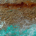 “Fractured Horizon” is an evocative, moody landscape that explores the raw intersection of earth and water. This mixed media acrylic painting explores the quiet drama of natural erosion and emotional depth through heavily textured surfaces. Built with modeling paste and marble powder, the layered composition evokes geological strata—weathered, fractured, and timeless. Muted earth tones are interrupted by a restrained band of turquoise, suggesting water, memory, or renewal beneath a hardened surface. The expressive texture invites close inspection, where light catches on ridges and cracks, revealing a balance between raw force and subtle calm. The work conveys stillness shaped by time, resilience, and unspoken movement.