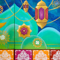 In Spreading Happiness, I celebrate the quiet magic of Ramadan — a time when hearts soften, homes glow, and kindness flows effortlessly from one soul to another. The golden crescent moon gently floating in the deep blue sky becomes a symbol of renewed faith and reflection. Hanging lanterns radiate warmth, representing guidance and hope that illuminate our path during this sacred month. Behind them, layered emerald domes and intricate floral motifs echo the beauty of spiritual unity and shared traditions. At the base, vibrant ornamental panels in joyful hues of pink, orange, and green reflect celebration — reminding us that devotion and happiness can coexist in the most colorful way. Through luminous tones and gentle radiance,